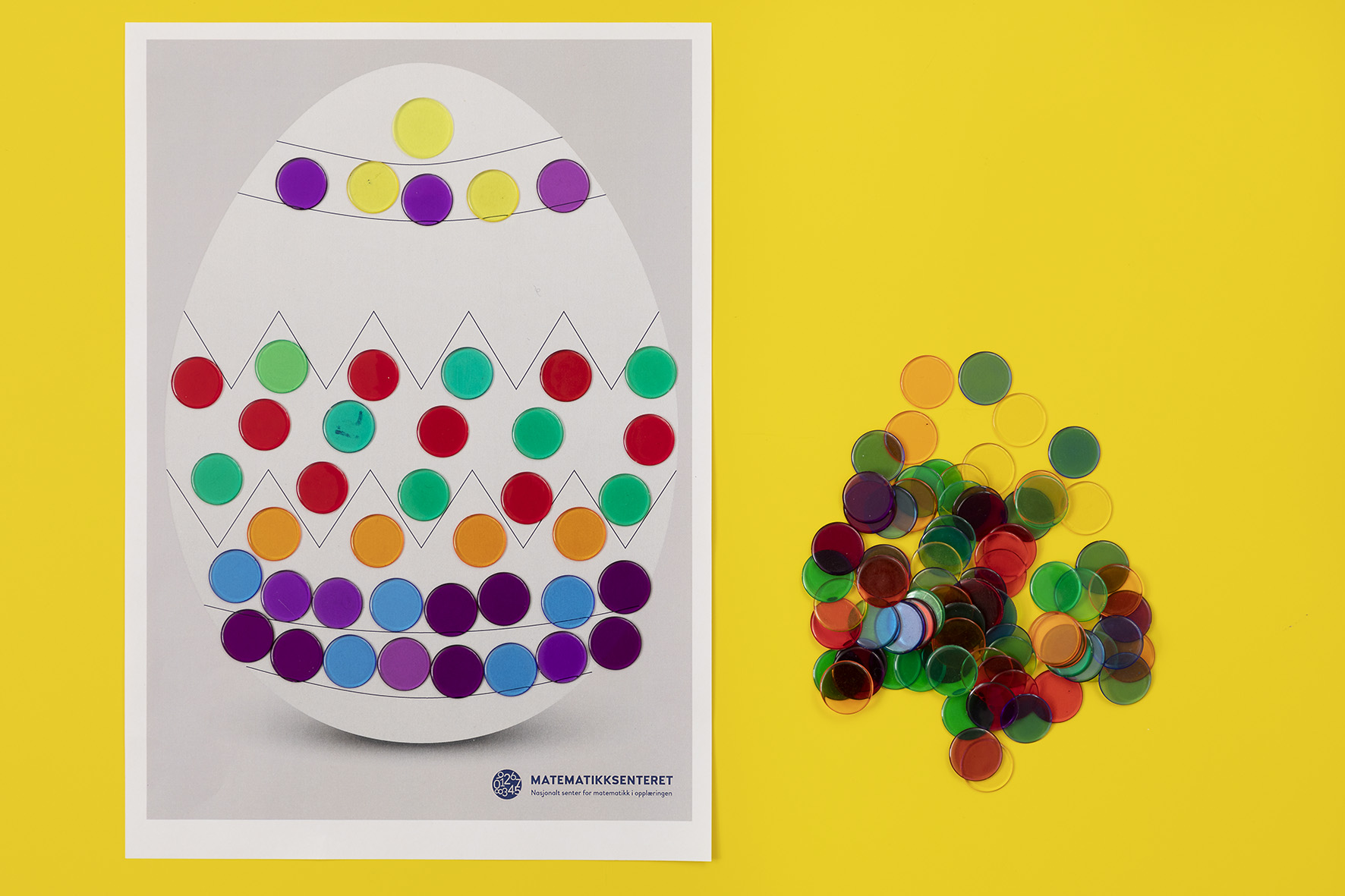 Skriv ut eller tegn av egg-malen. Legg fram ulike objekter fra barnehagehverdagen som dere pynter egget med. Mange vil velge å pynte egget med selvvalgte mønstre. Et mønster kan for eksempel være et repeterende mønster: gul, rød, gul, rød, gul, rød, gul, rød. Bruk aktivt begreper som beskriver hvordan barna pynter egget. Relevante begreper kan være: annenhver, hver tredje, en mer, vokser, gjenta, større, på linje, på skrå, sikk sakk, symmetrisk, midten, oppover, nedover, til venstre, til høyre.